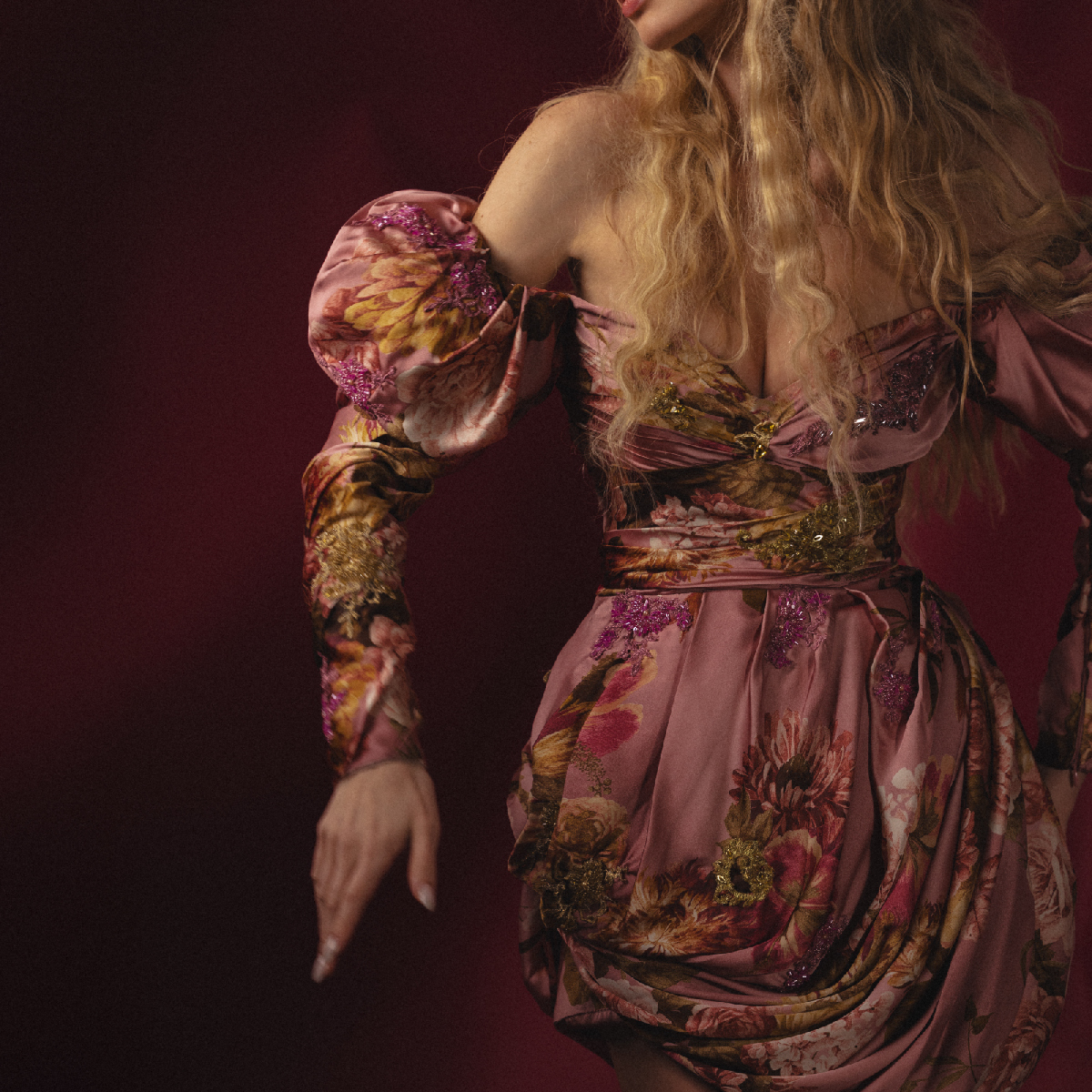 Short corset dress with pleats and puff sleeves, made of floral patterned satin, hand-decorated with embroidery and crystals.