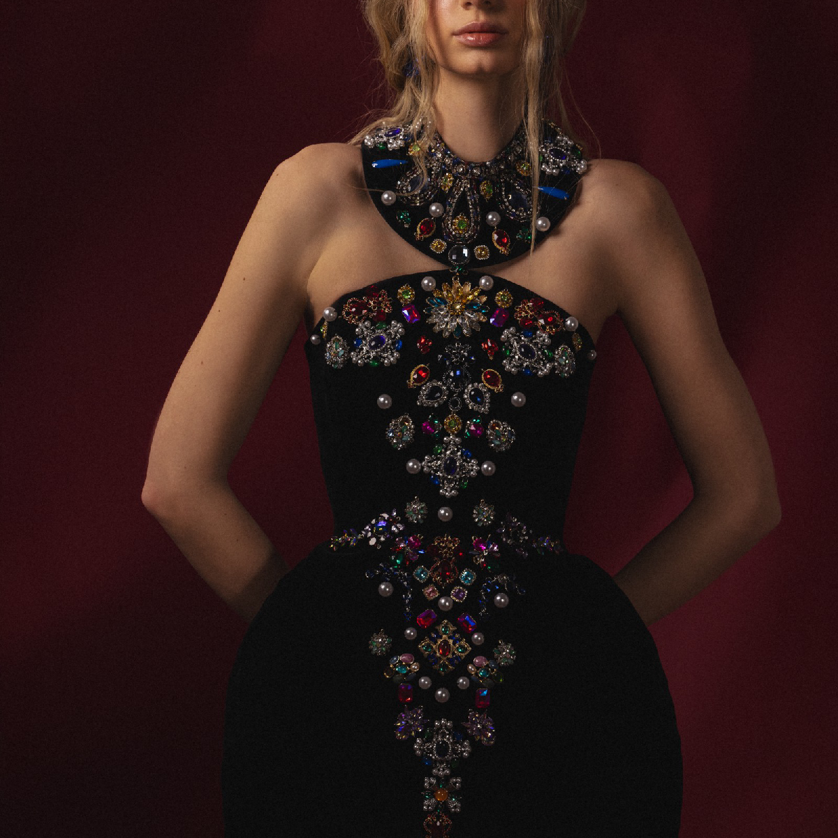 Mini corset dress made of denim plush material, hand-decorated with crystals.